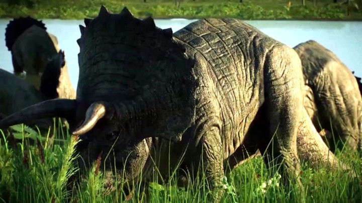 庞大的种群 + 恐怖的战力 + 群居的战术,让三角龙成为了整个白垩纪生态系统中,最具威胁性的存在,就连站在食物链顶端的霸王龙,都只能选择捕食幼年、老年或落单的三角龙,根本不敢招惹健康的成年三角龙群!